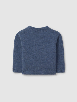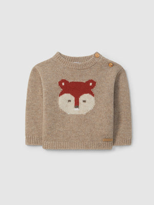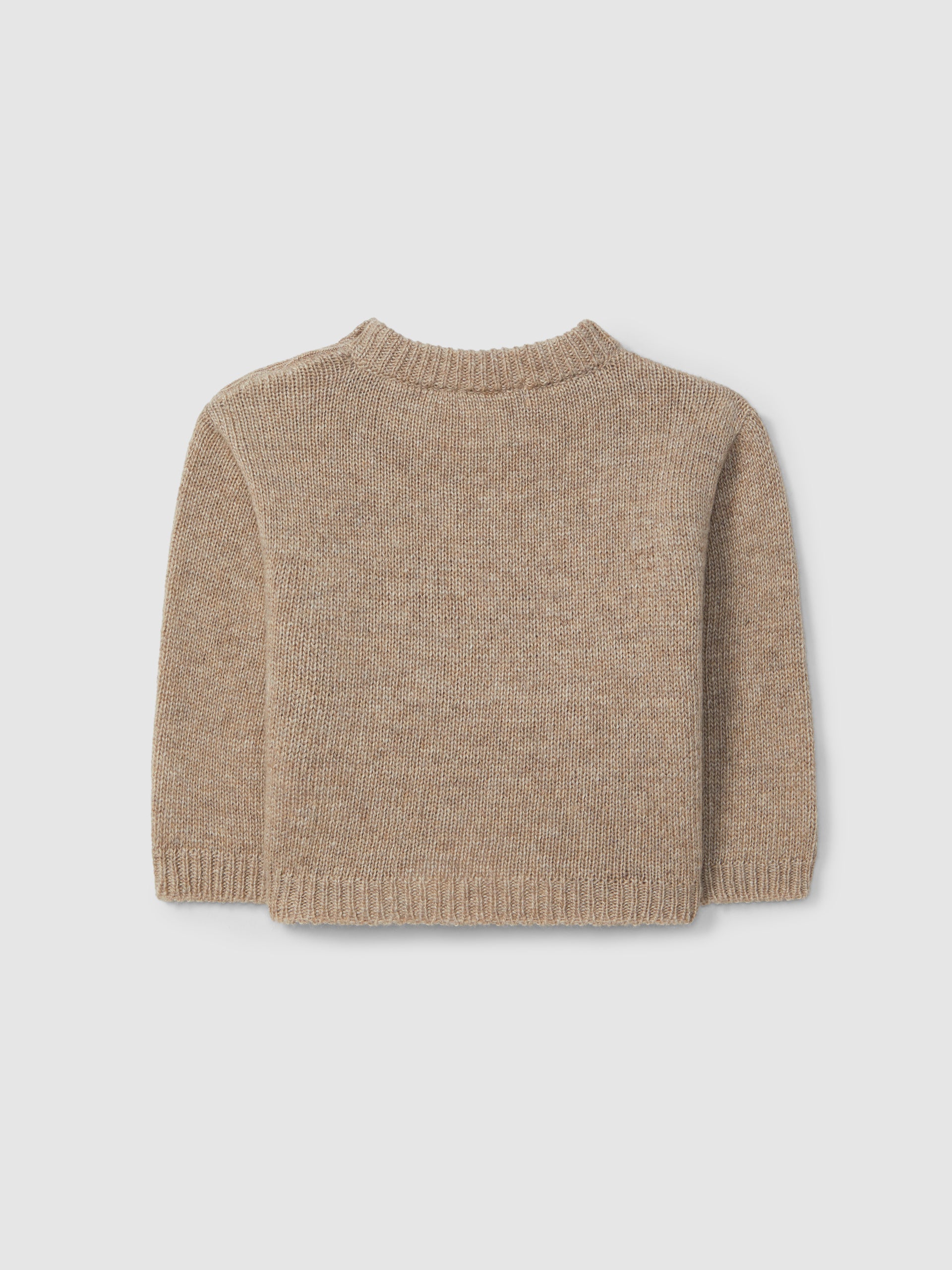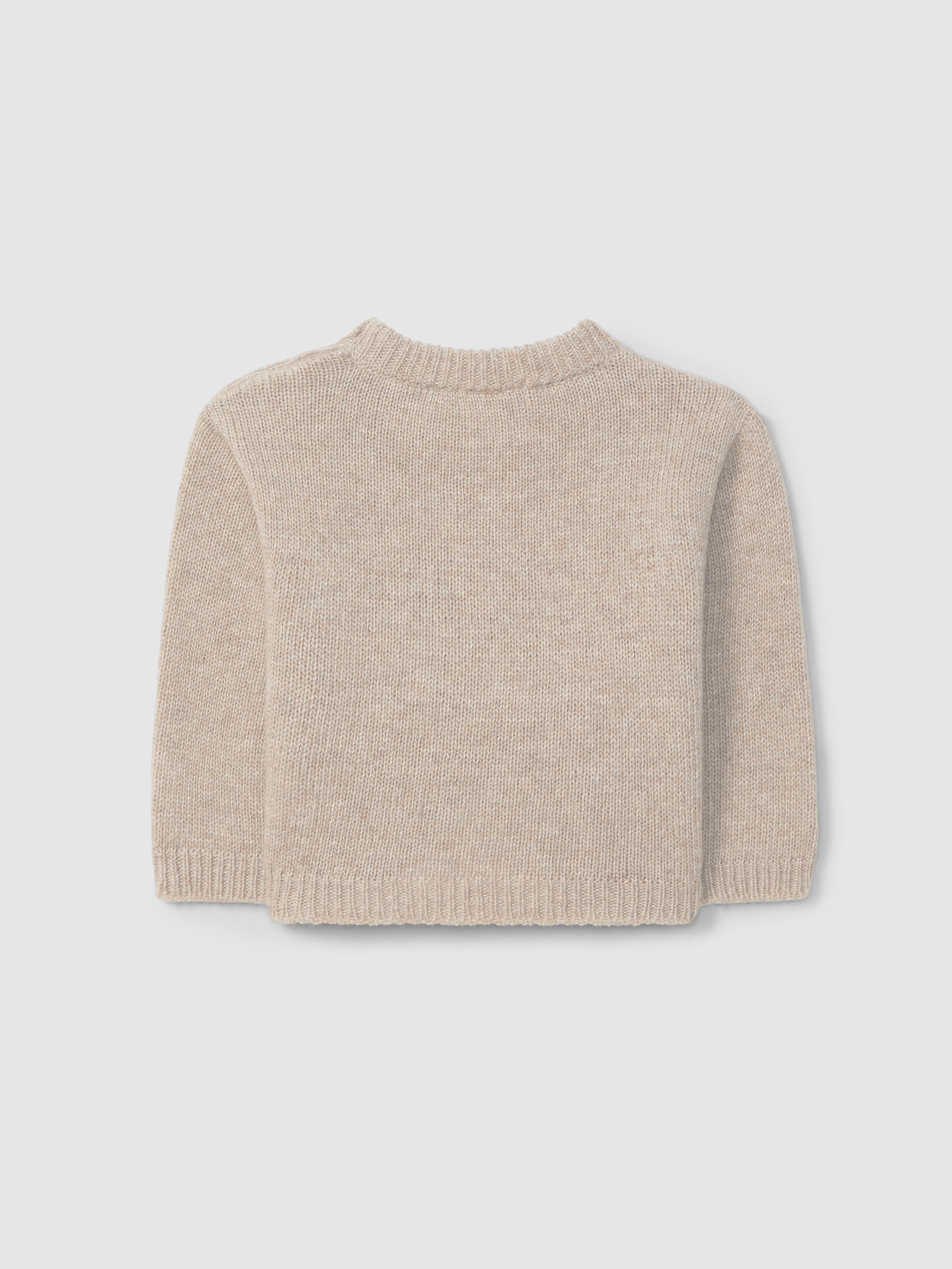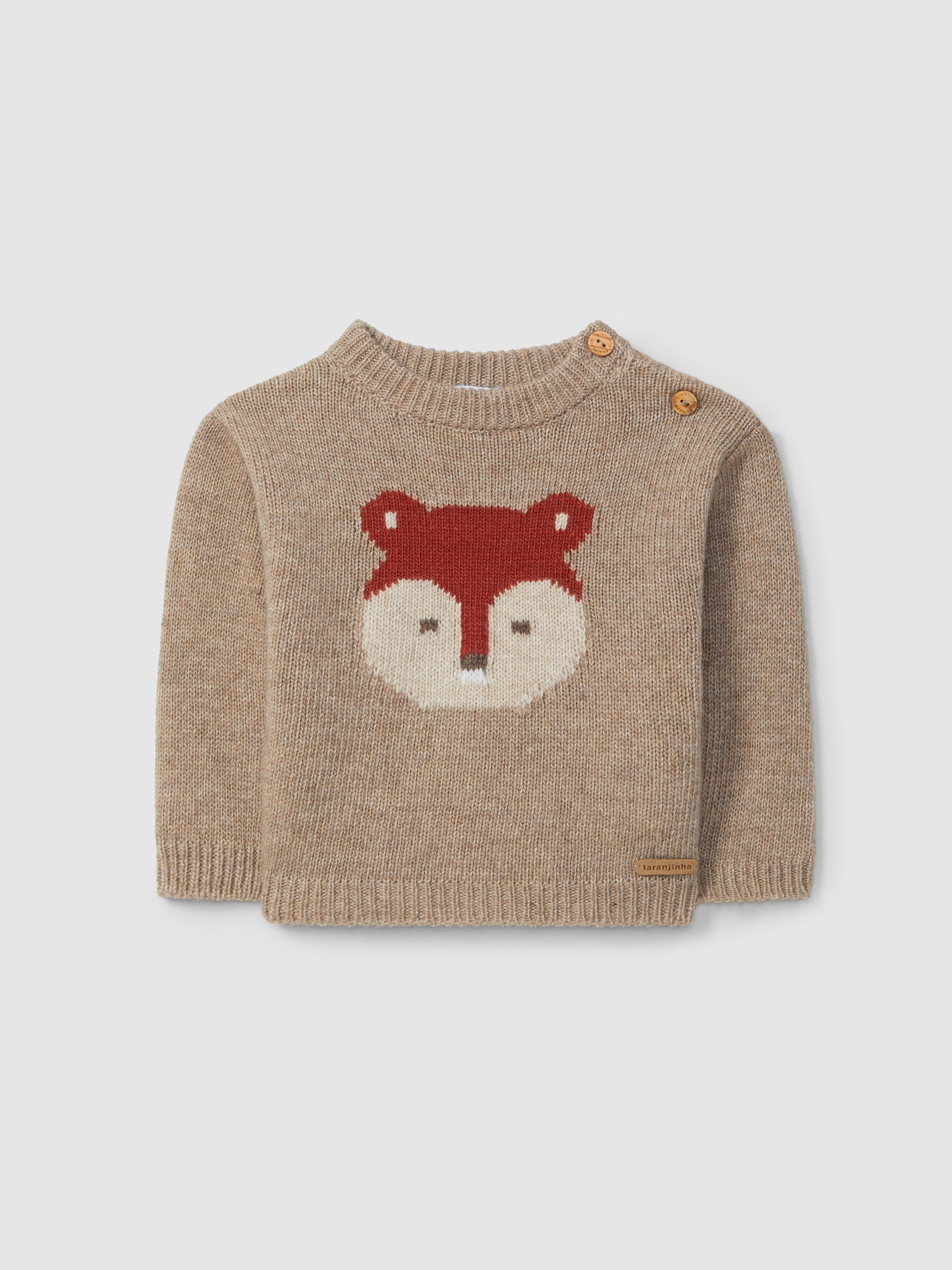 Pull tricoté avec une touche de cachemire et intarsia figurative sur le devant. Ouverture avec des boutons en bois « Laranjinha » sur l’épaule.