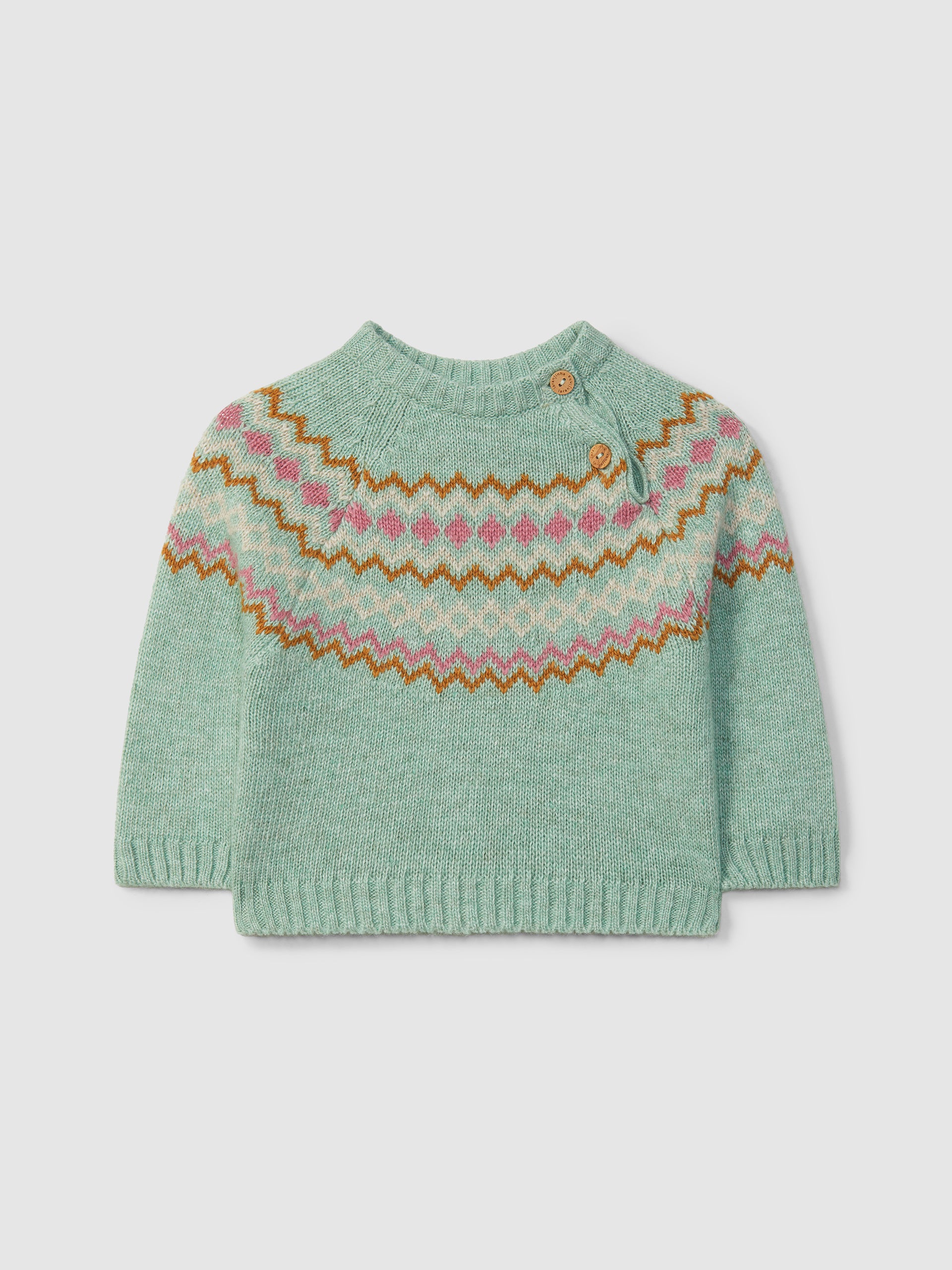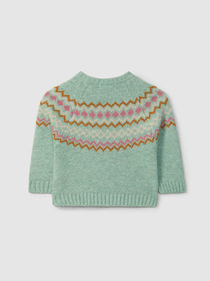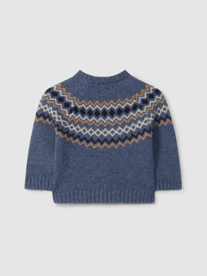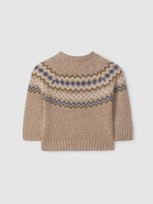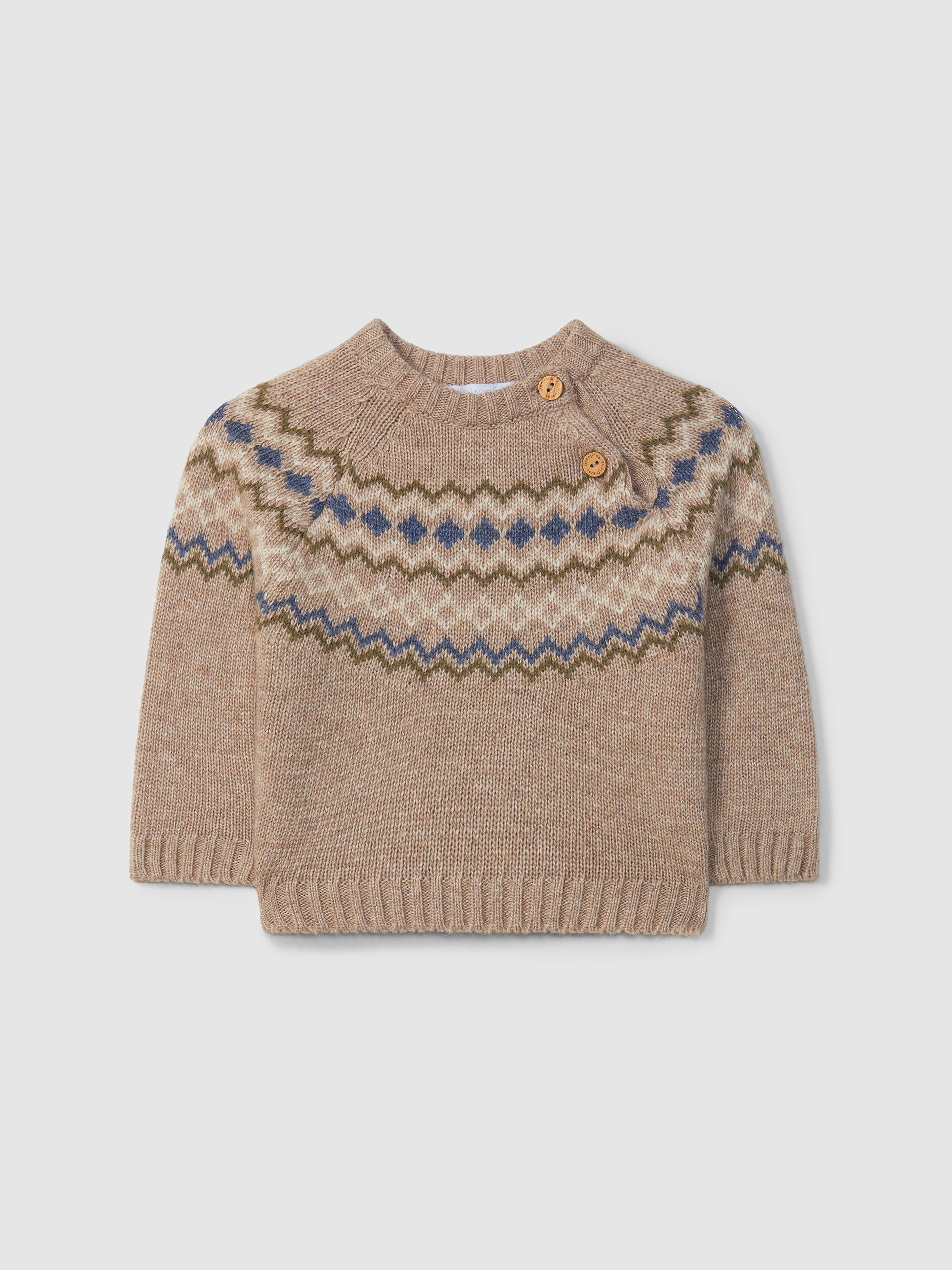 Pull tricoté avec jacquard et avec une touche de cachemire. Ouverture avec des boutons en bois « Laranjinha » sur le devant jusqu’à la taille 24 mois.