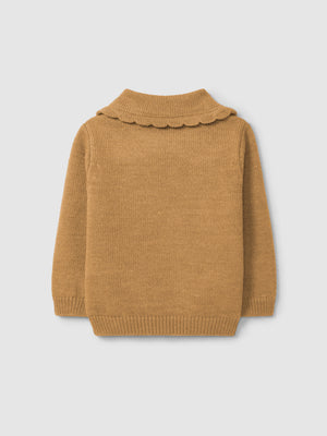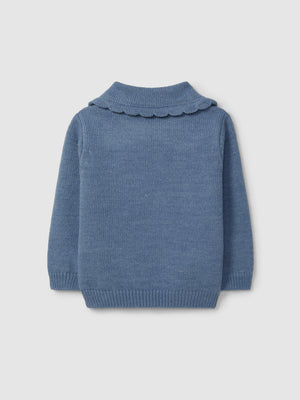 Pull tricoté. Détail de fleurs délicates brodées sur le col.