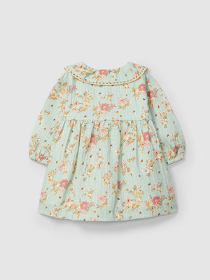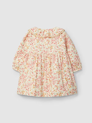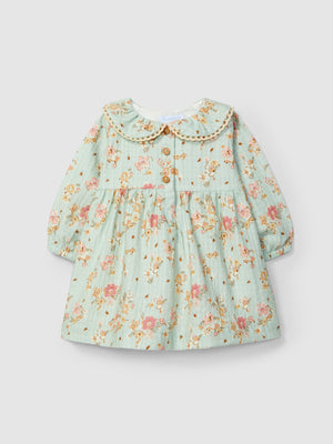 Robe en tissu texturé 100 % coton avec imprimé fleuri exclusif Laranjinha. Col avec détail de dentelle. Ouverture avec des boutons en bois « Laranjinha » sur la poitrine.