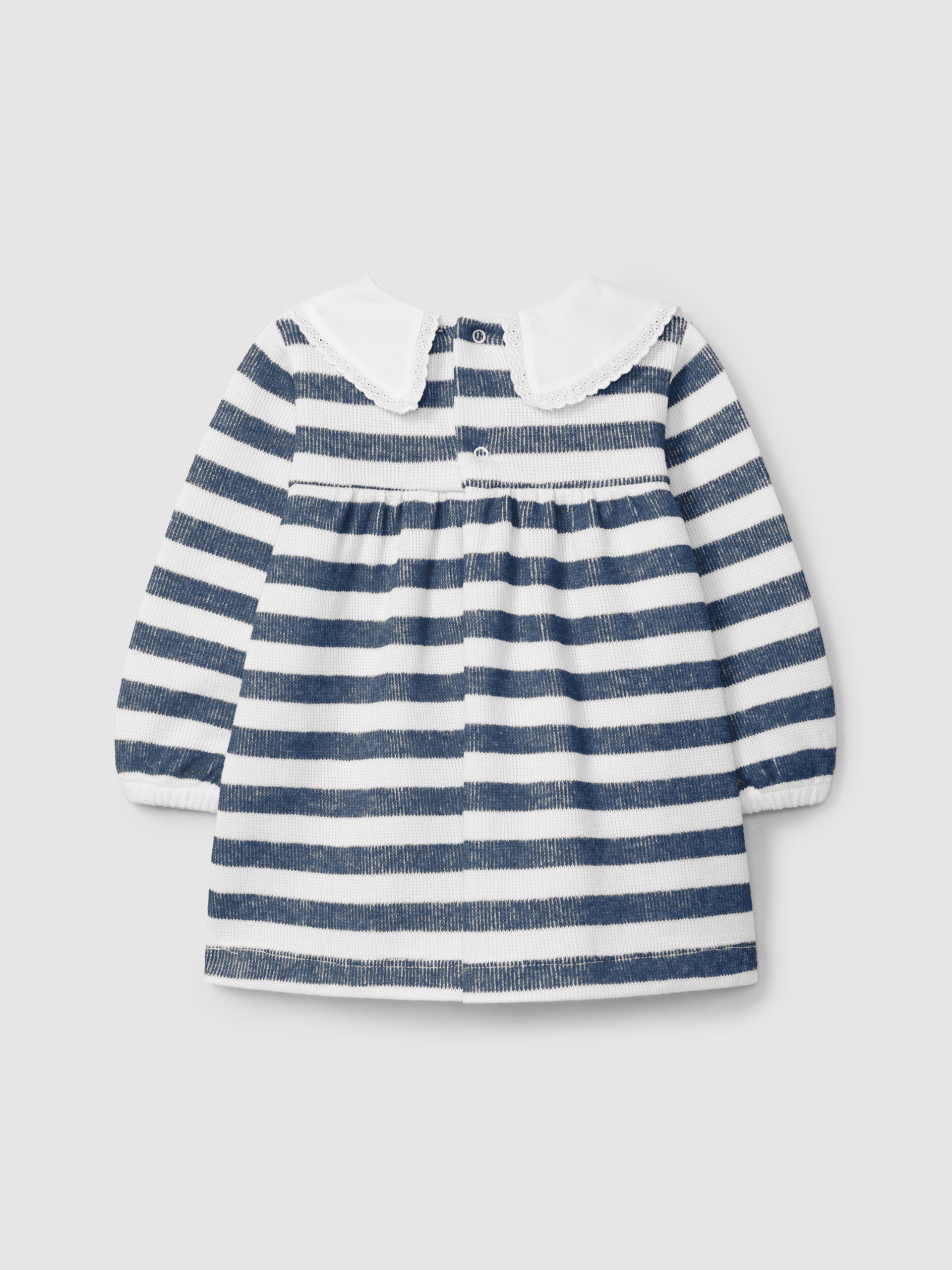 Robe en maille à rayures avec aspect tricoté 100 % coton. Col en tissu avec détail en dentelle. Fermeture avec des pressions dans le dos.