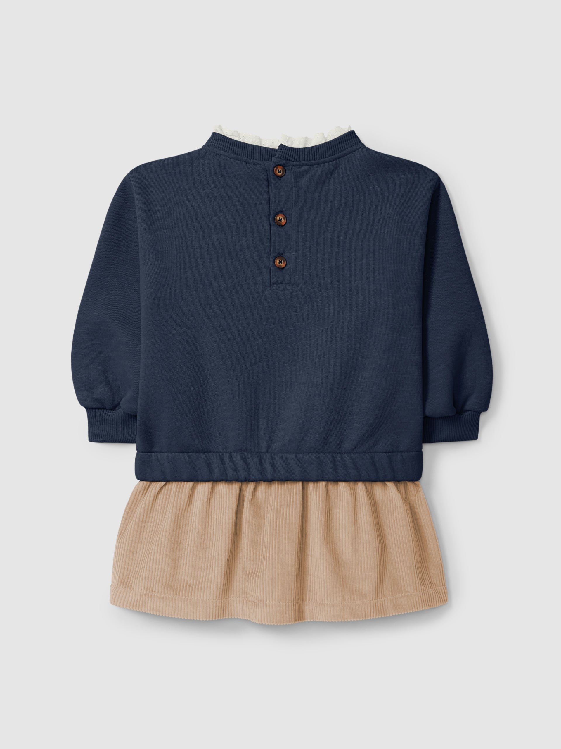 Robe avec broderie « Amore ». Pull en peluche cardée 100 % coton avec détail en broderie anglaise au col. Jupe en velours côtelé léger et malléable. Ouverture avec des boutons dans le dos.