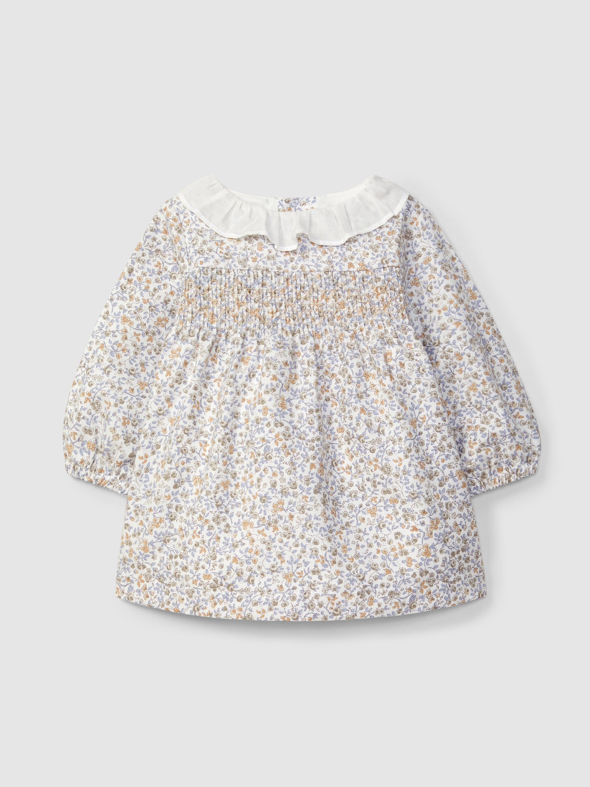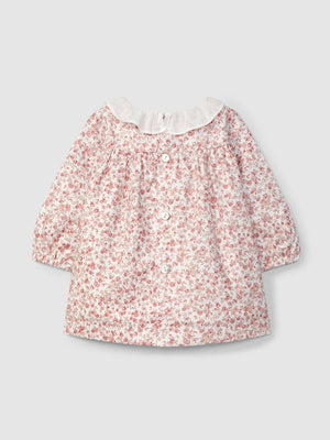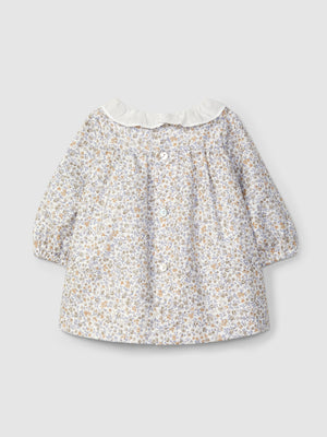 Robe en sergé 100 % coton fon et malléable avec imprimé à fleurs, détail de smocks sur la poitrine et col à volant. Ouverture avec des boutons en nacre « Laranjinha » dans le dos.