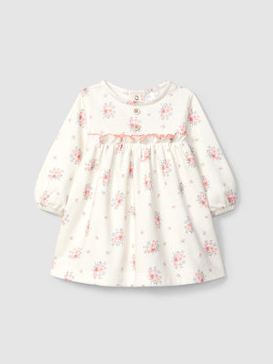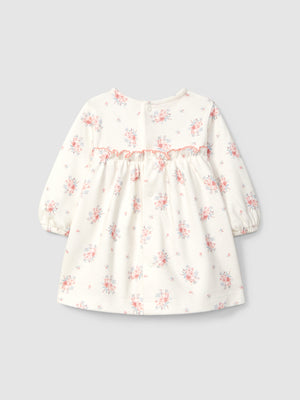 Robe en maille cardée 100 % coton avec imprimé à fleurs exclusif « Laranjinha ». Détail de volant avec liseré de couleur en contraste. Boutons décoratifs sur le devant. Fermeture avec des pressions dans le dos.
