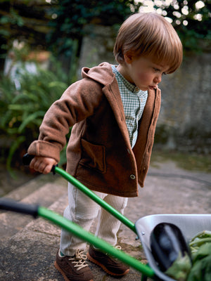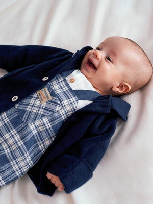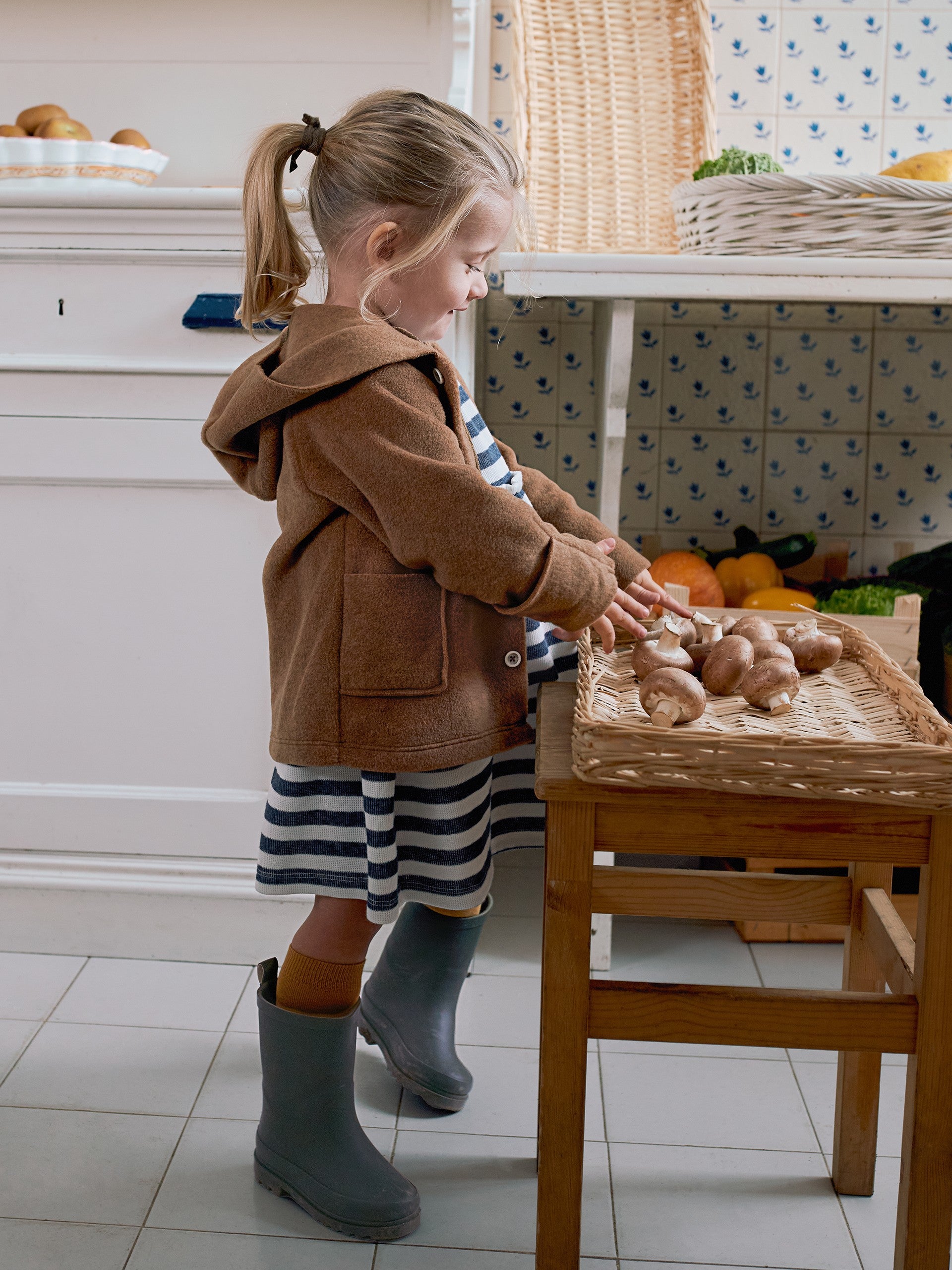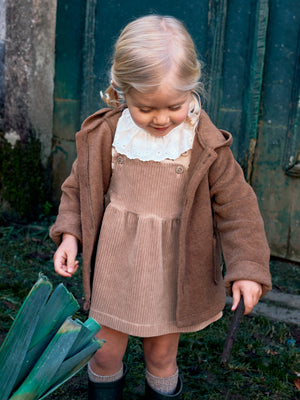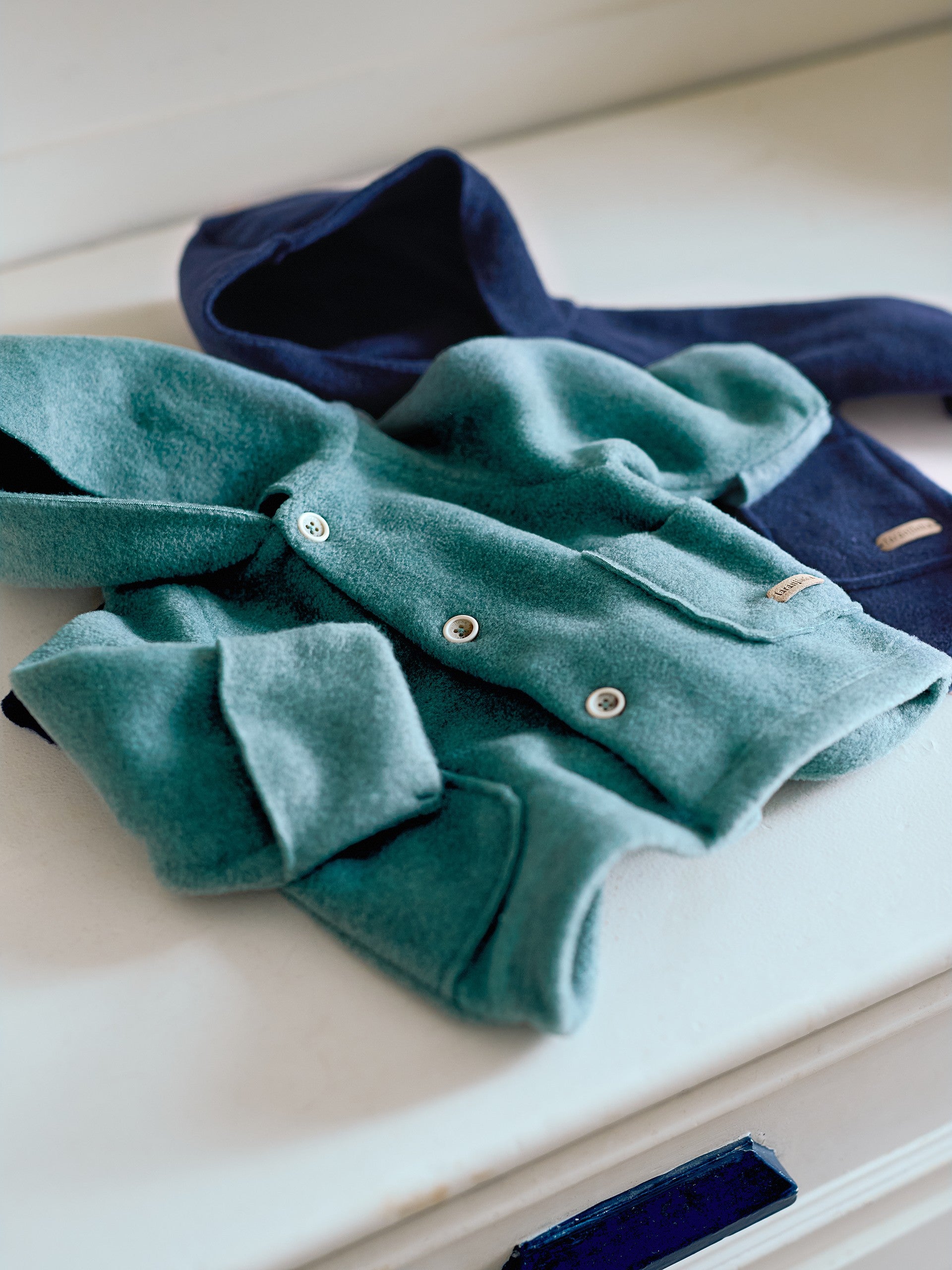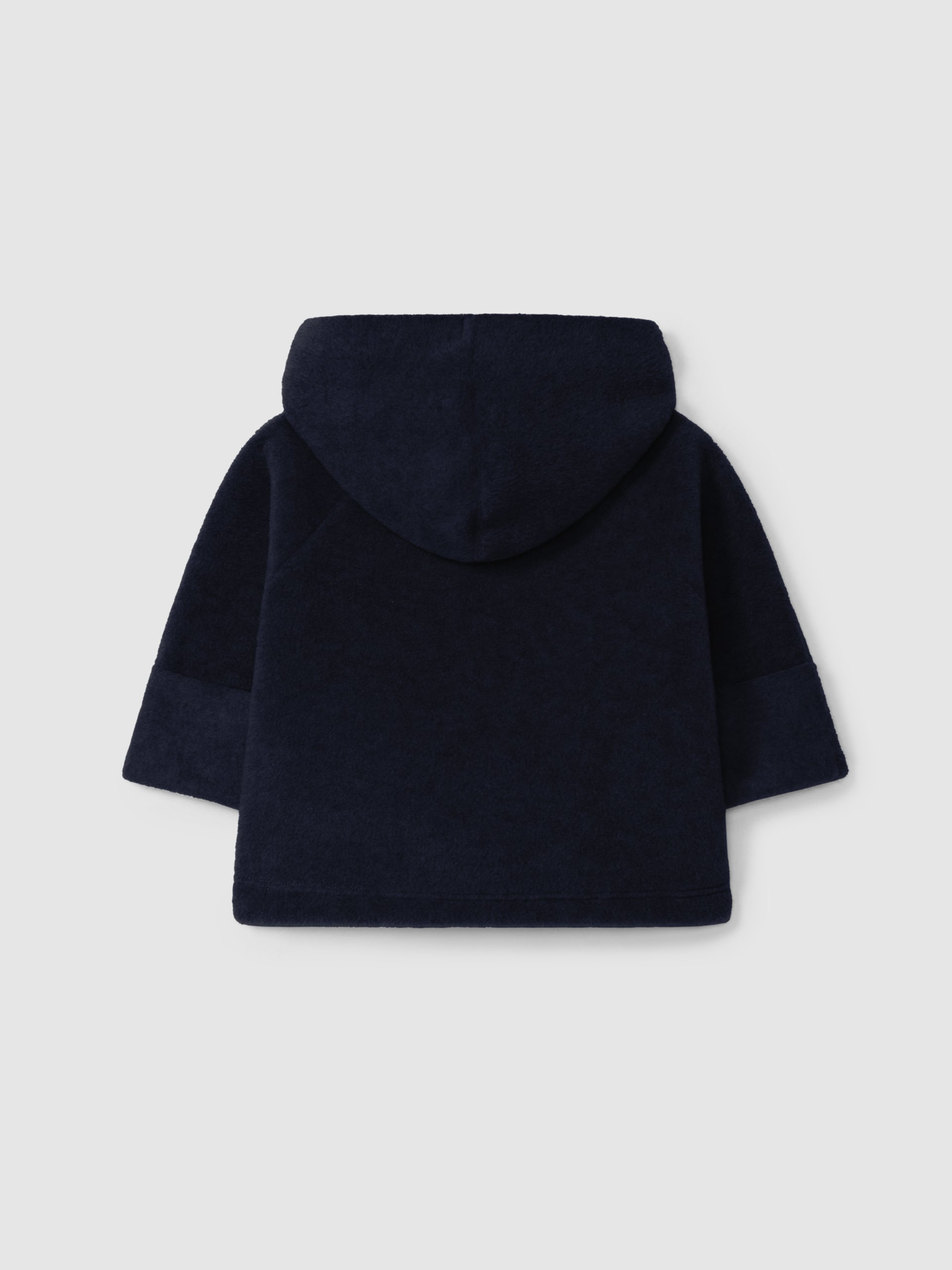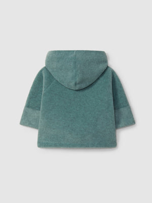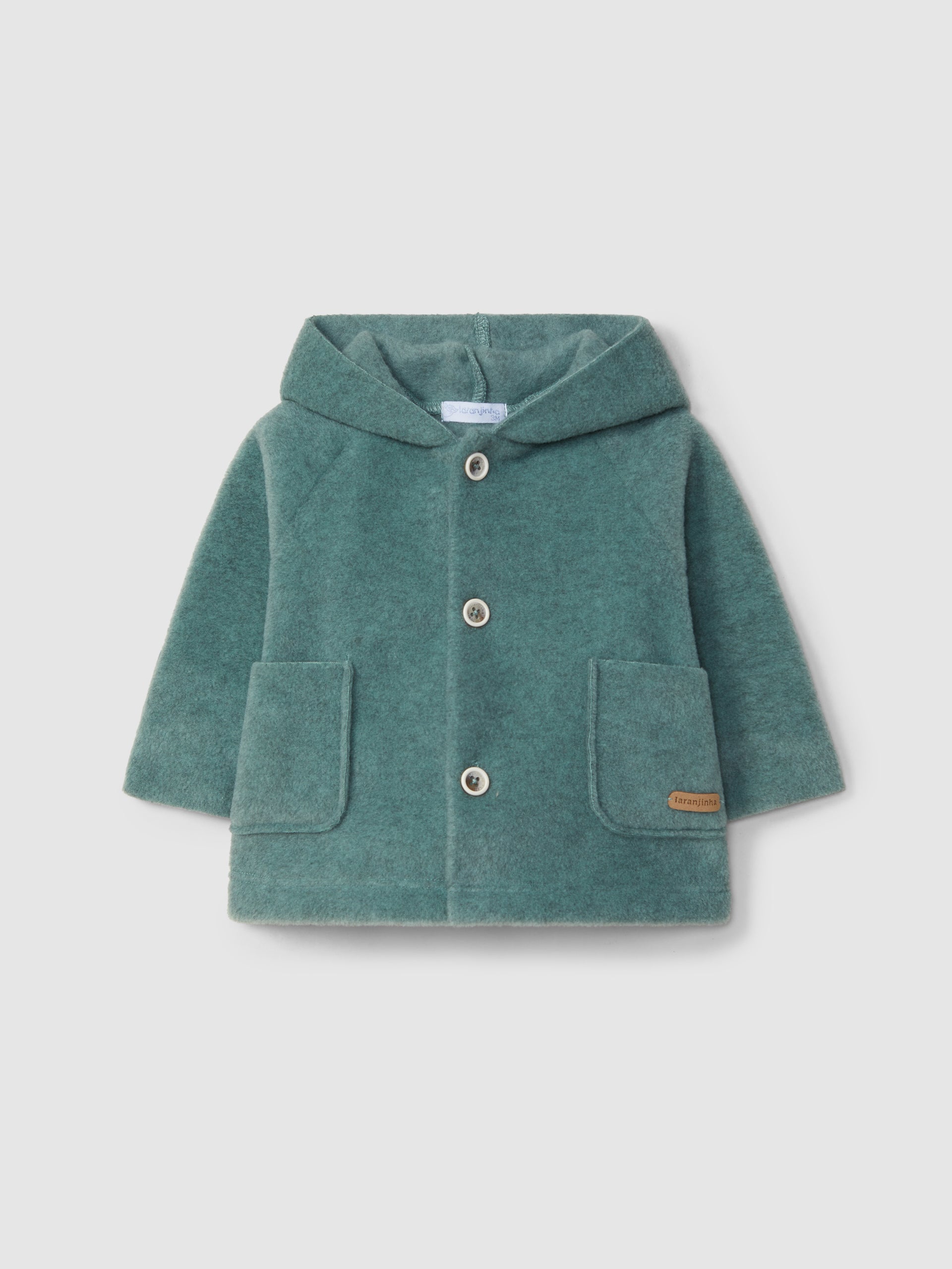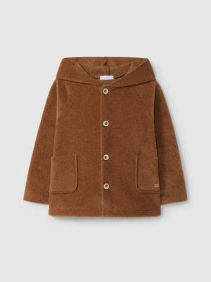 Veste polaire à capuche et poches fonctionnelles sur le devant. Les manches peuvent être portées comme des gants jusqu’à la taille 24 mois. Fermeture avec des boutons sur le devant sur toute la longueur.